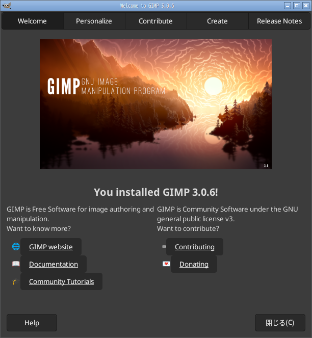 「閉じる」 起動直後の状態です。 2025年10月31日の時点で、下記のバージョンでした。 操作については、「画像編集ソフト GIMP」に掲載しています。 上記は簡単なものですので、詳細なものがほしい方は、各所に初歩の手引きから応用編までありますので、そちらを参考にしてください。 |