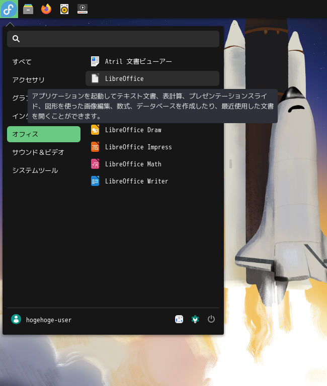 「LIbreOffice Start Center」がメニューに表示されないので。