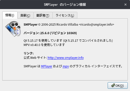 1. 概要 メディアプレイヤーとして、「SMPlayer」をインストールして使います。 2. インストール 「SMPlayer」のインストールには、「unitedrpms」というリポジトリを追加する必要があります。 リポジトリ追加の手順に関しては、「Fedora - 43 - 共通事項」をご参照ください。 リポジトリを追加したら、「root」ユーザ権限で。 dnf install -y smplayer openh264 3. 起動 「スタート」→「サウンドとビデオ」→「SMPlayer」