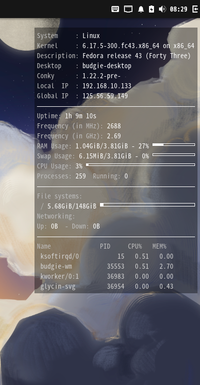 「システム名」「カーネルバージョン」「ディストリビューション」「デスクトップ名」「Conky バージョン」「アドレス」を複数行で表示します。