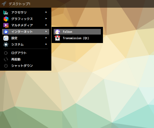 1. 概要 ブラウザとして、「Falkon」がデフォルトでインストールされています。 2. 起動 「スタート」→「インターネット」→「Falkon」
