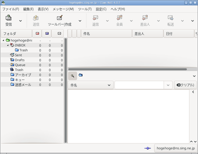初回起動時は「設定ウィザード」から始まります。 起動直後の状態です。 2025年11月4日の時点で、下記のバージョンでした。 「設定ウィザード」他、操作方法については、「メールクライアント - Claws Mail」をご参照ください。 |