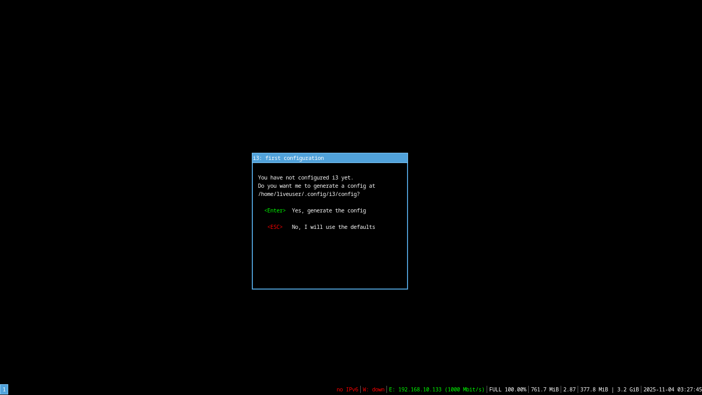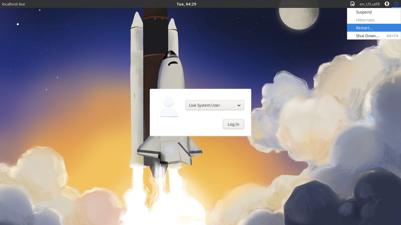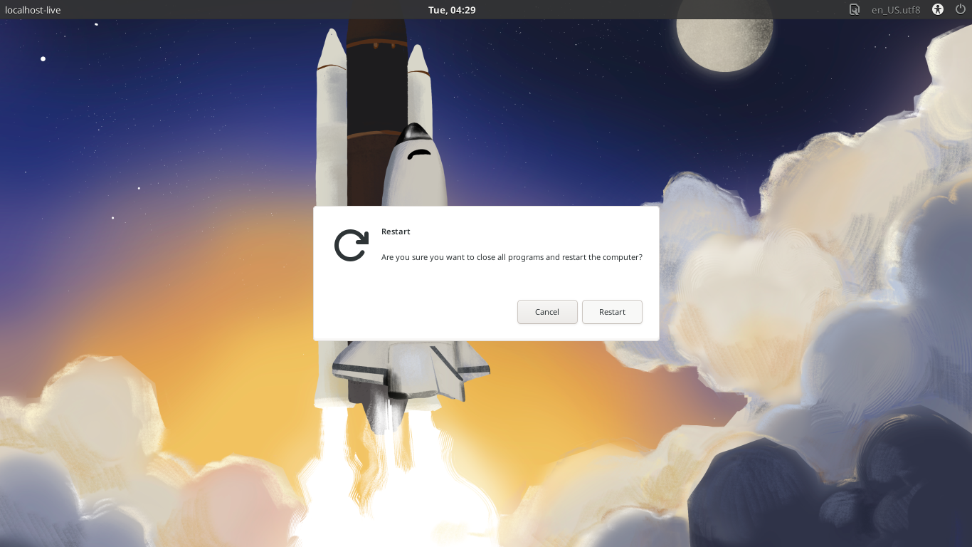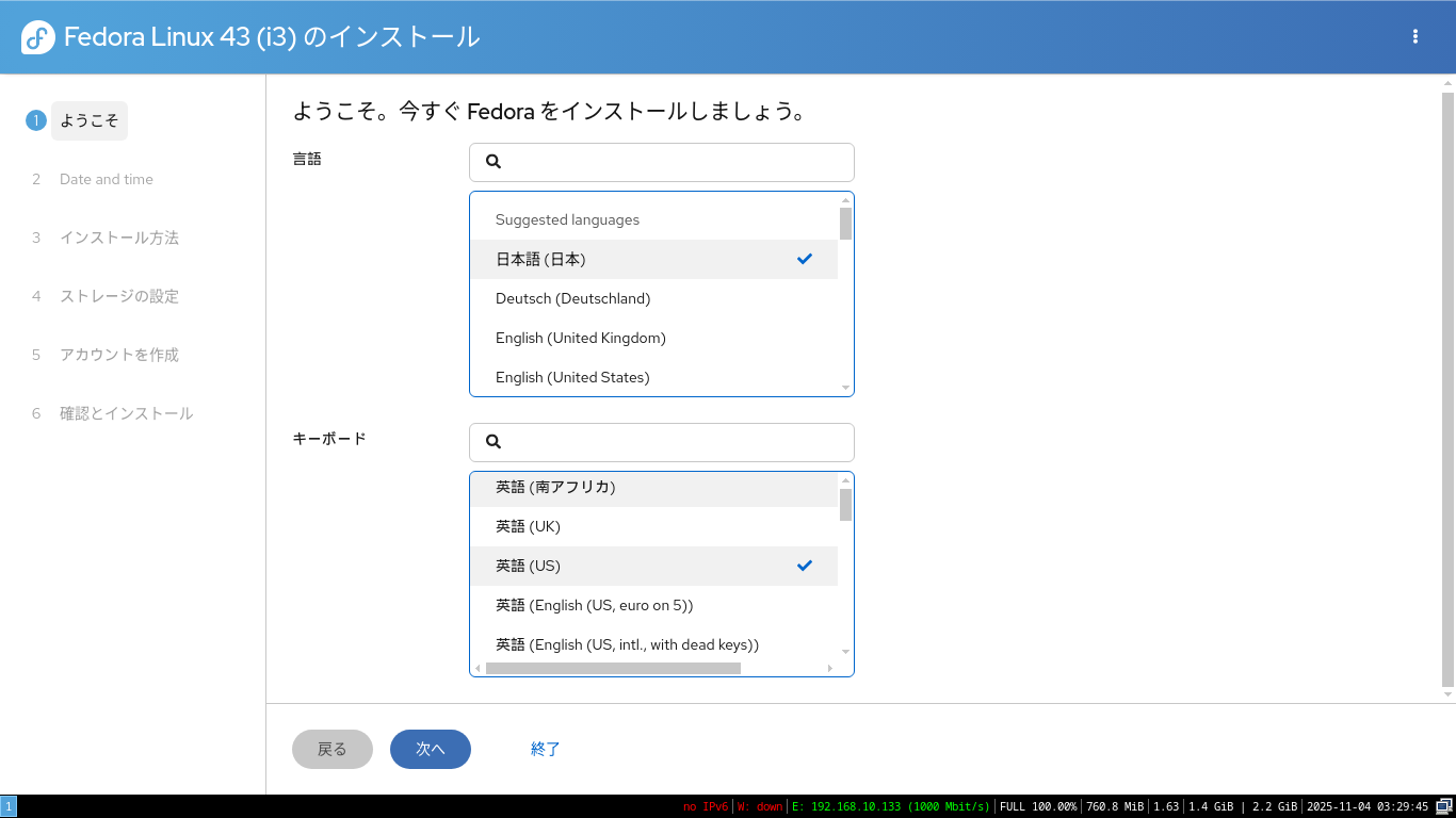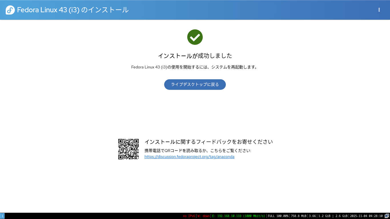 Enter Win+D で、上部の「d_menu」を表示して 「live」と入力した時点で、「liveinst」が選択状態になりますので、そこで Enter インストーラが、起動します。 以降の手順は「Fedora - 43 - MATE」と同様となりますので、そちらをご参照ください。 インストールが、完了したら。 「ライブデスクトップに戻る」