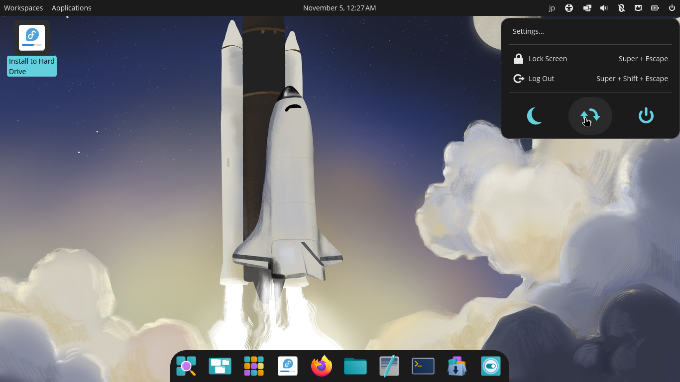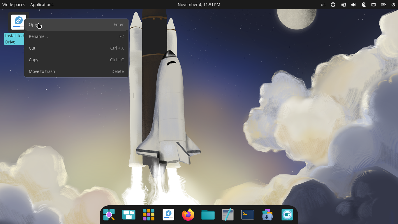 1. 概要 画面や操作が「MATE」と若干異なる部分がありますので、記載しますが、その他は「Fedora - 43 - 共通事項」のインストールの手順をご参照ください。 インストール環境についても、上記をご参照ください。 2. 起動 インストーラ起動時に、デスクトップ画面から始まります。 「Install to Hard Drive」を右クリックして 「Open」