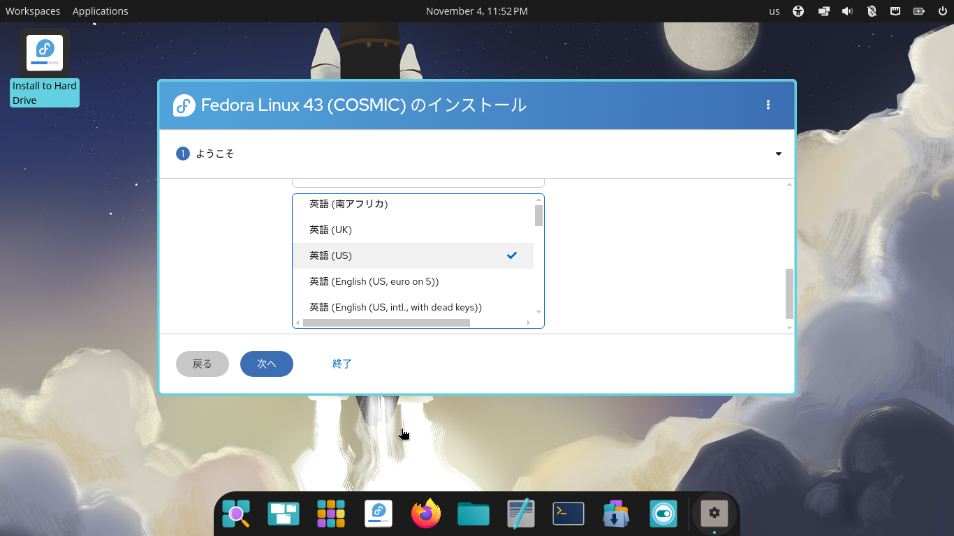 3. インストール 以降の手順は「Fedora - 43 - MATE」と同様となりますので、そちらをご参照ください。