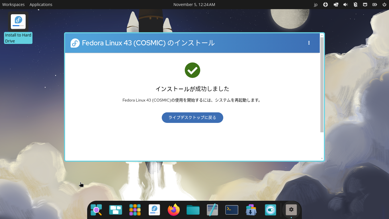 インストールが、完了したら。 「ライブデスクトップに戻る」