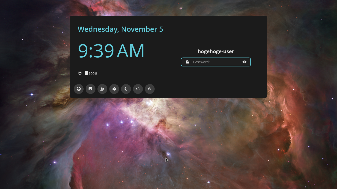 デスクトップ右上、電源アイコン「」→ 再起動アイコン「」