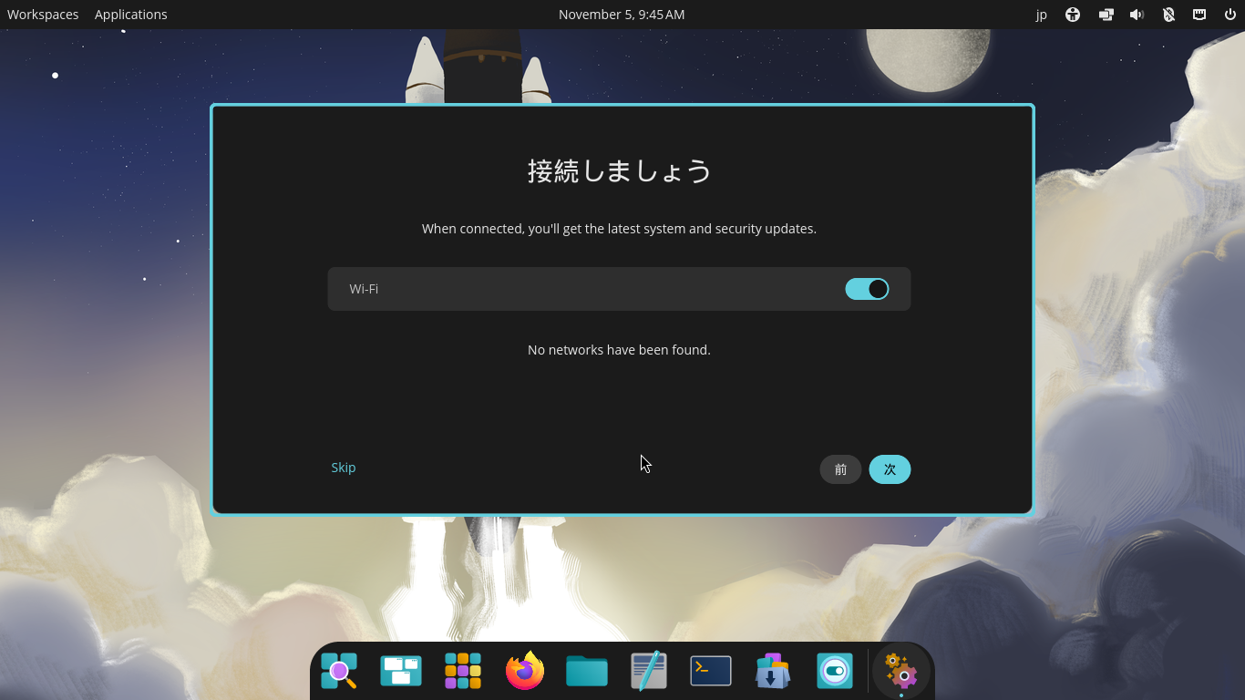 環境に合わせて設定します。 わたしは、「Wi-Fi」を使用していなかったので、オフにして、「スキップ」しました。 使用する言語を選択して。 「次」 使用するキーボードレイアウトを選択します。 日本語を探すのには、苦労します。 「次」 なんか、変な日本語だな。 設定する場所を選択して。 「次」 もういいや。 「スキップして閉じる」 やっと使えるようになります。