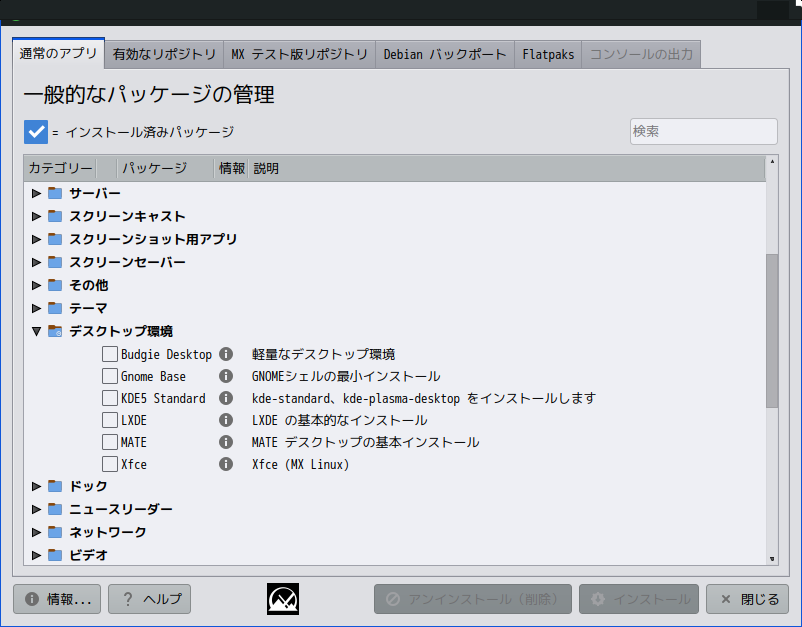 上記以外のデスクトップ環境を使用するには、「MX パッケージインストーラ」を使用してインストールすることになります。