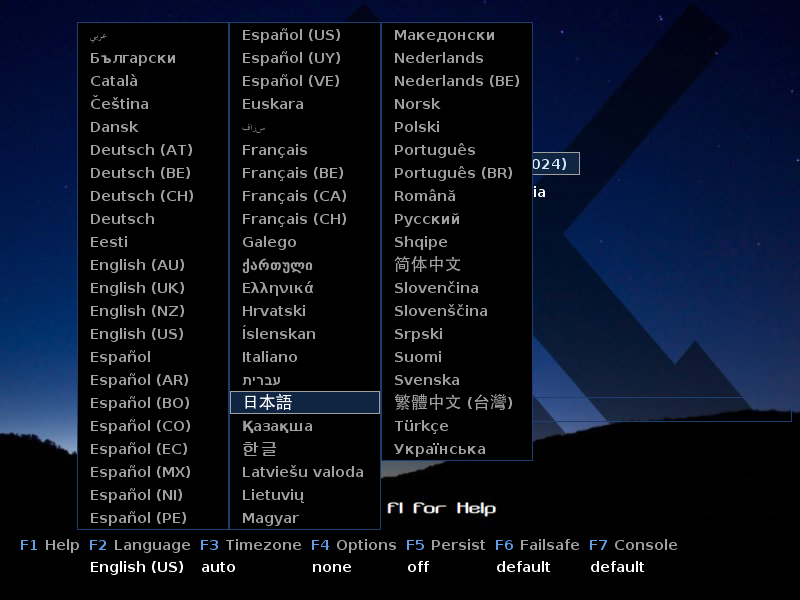 メディアをドライブにセットして起動します。  F2 で「Language」を表示