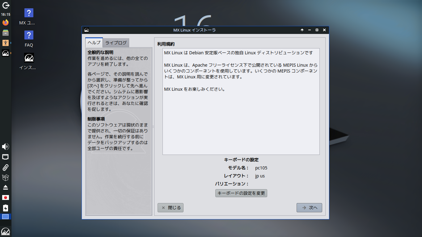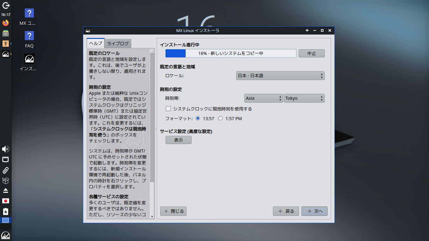 「MX Linux 23.4」-「インストール」「ロケーション・タイムゾーン」
