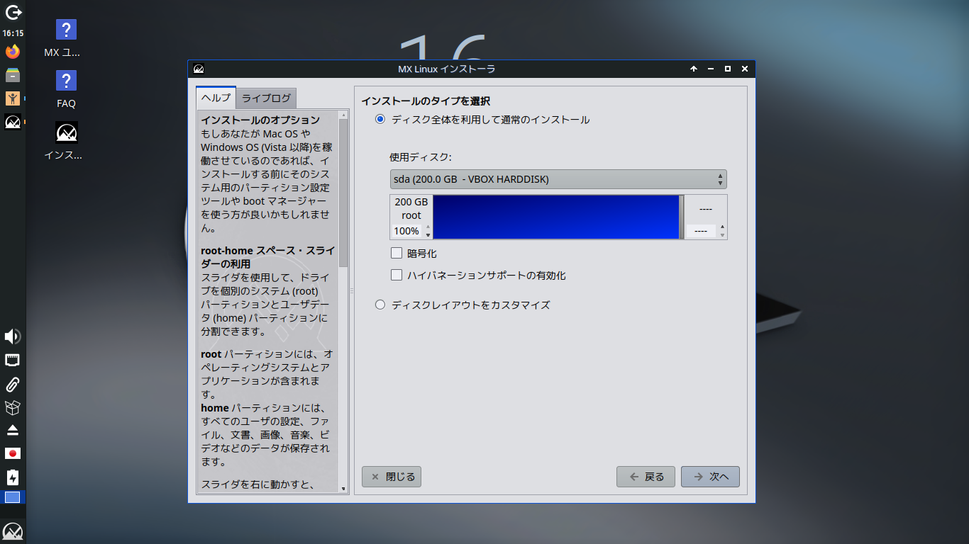 「MX Linux 23.4」-「インストール」「パーティション設定」