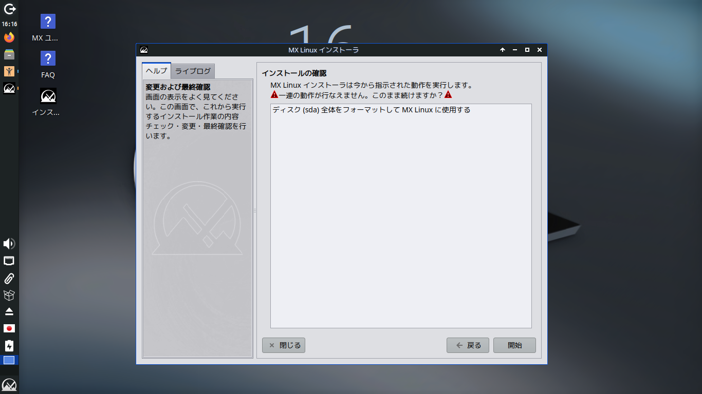 「MX Linux 23.4」-「インストール」「パーティション設定」「確認」