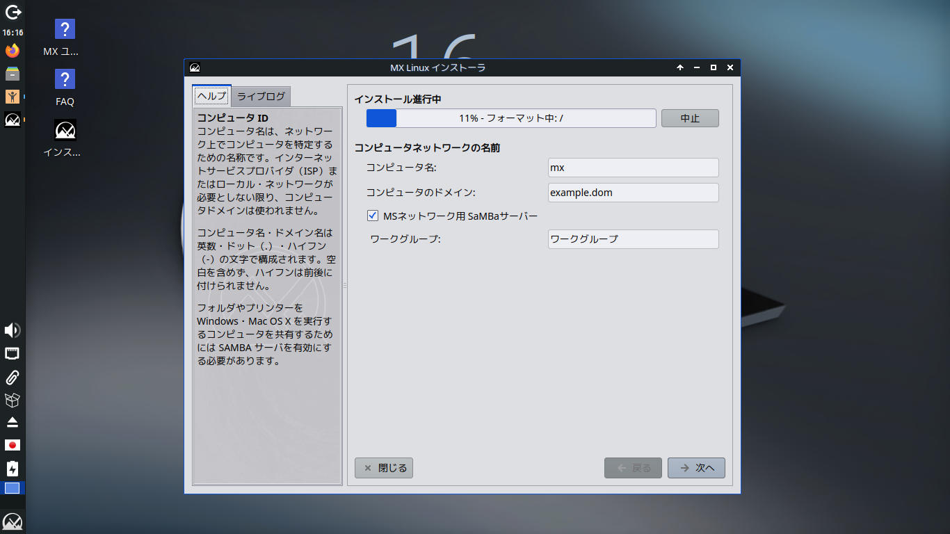 フォーマットの進行中に「マシン名」・「ドメイン名」を設定  わたしは、「Samba」は、使用しないので、チェックをはずします。  「次へ」