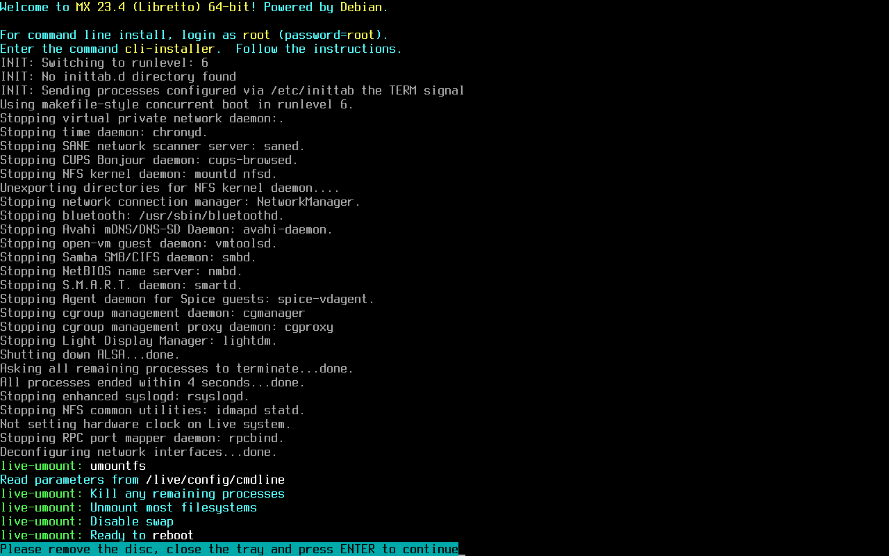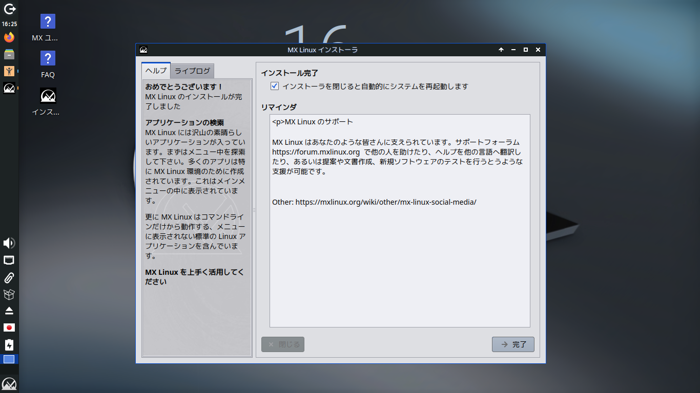 「MX Linux 23.4」-「インストール」「Installation Complete」