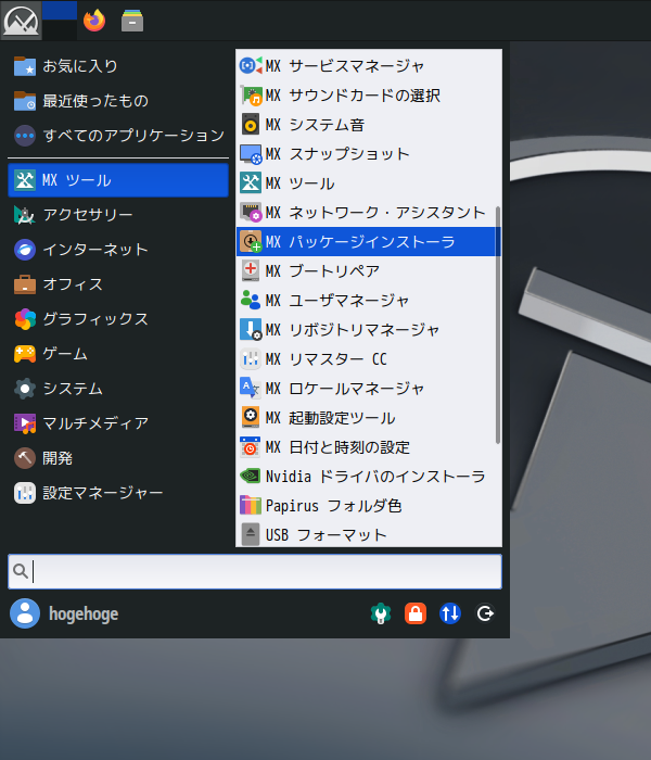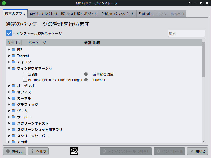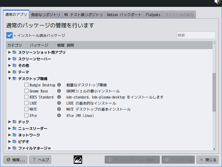 上記以外のデスクトップ環境を使用するには、「MX パッケージインストーラ」を使用してインストールすることになります。