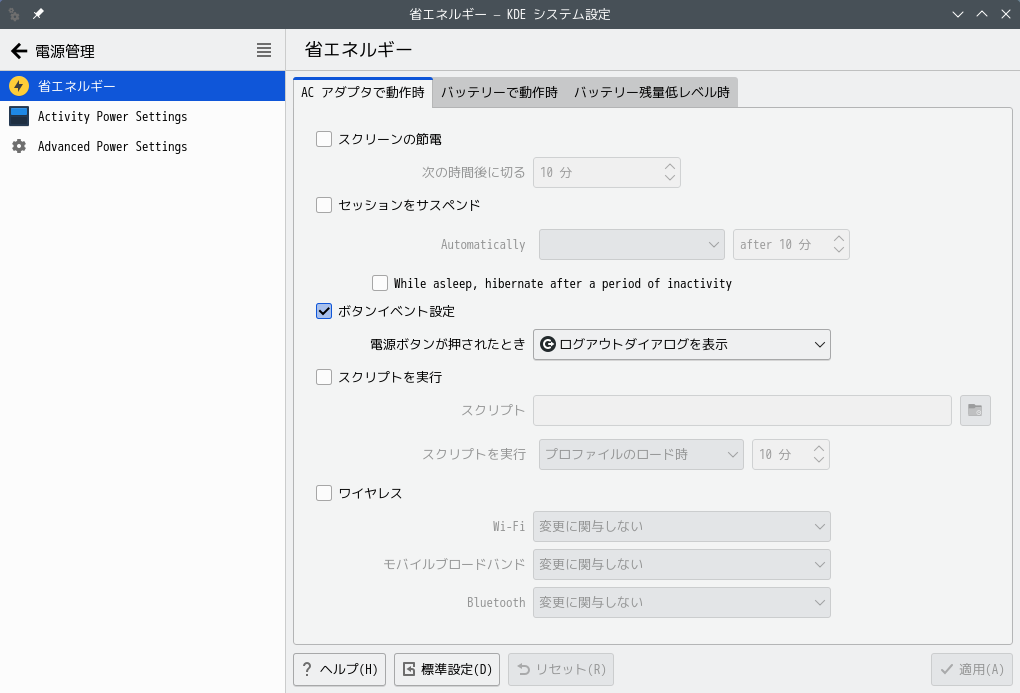 デフォルトでは、「スクリーンの節電」「セッションをサスペンド」にチェックがはいっていました。
