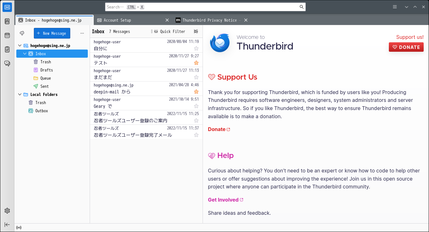 初回起動時は、「メールアカウントのセットアップ」から始まります。 起動後に、受信トレイを開いた状態です。 2024年5月22日の時点で、下記のバージョンでした。 |