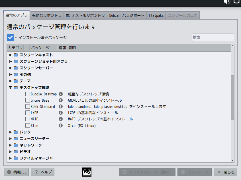 上記以外のデスクトップ環境を使用するには、「MX パッケージインストーラ」を使用してインストールすることになります。