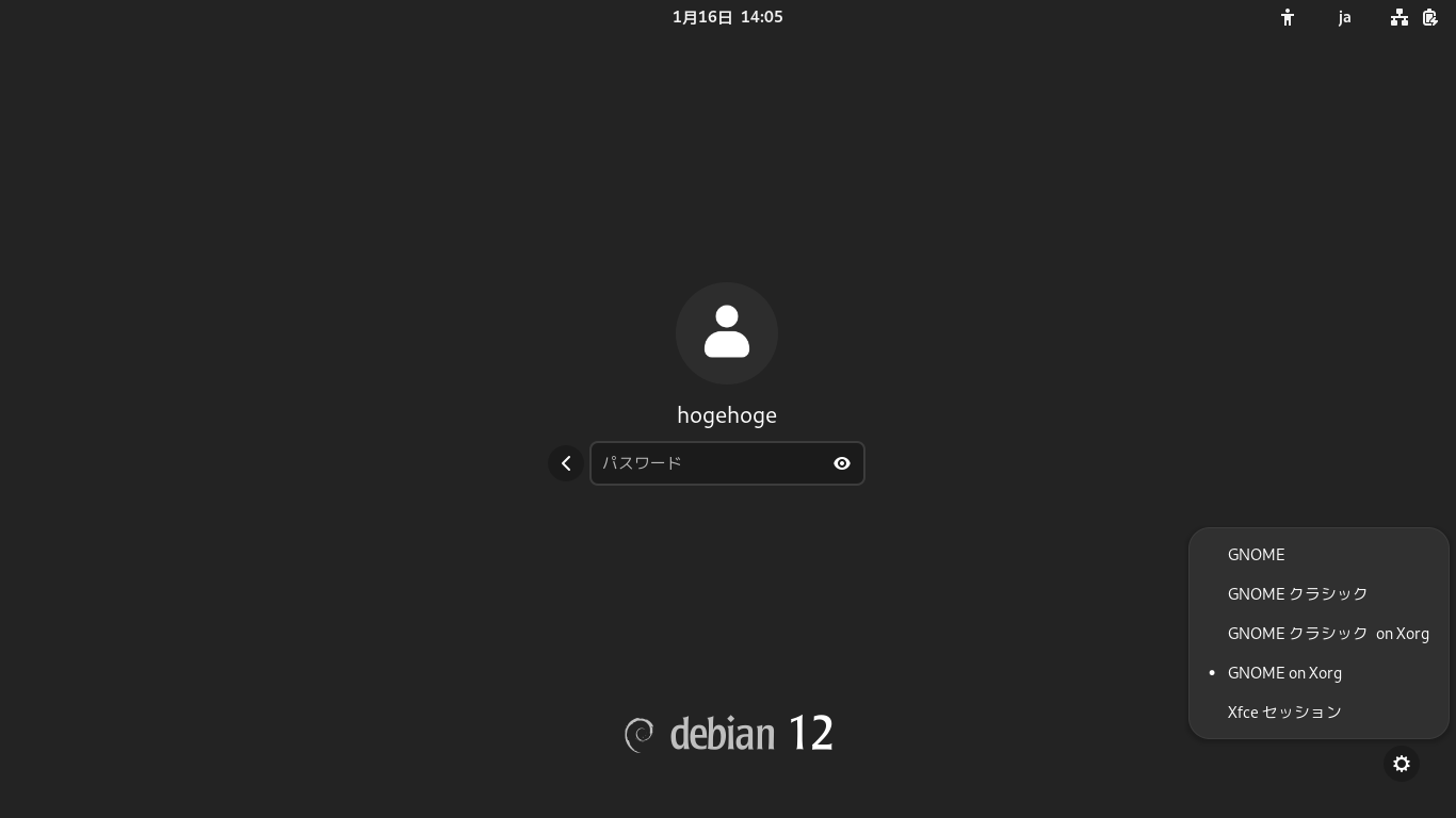 「VirtualBox」上にインストールしている場合は、ユーザをクリックして、歯車「」アイコンをクリックして「GNOME on Xorg」を選択します。