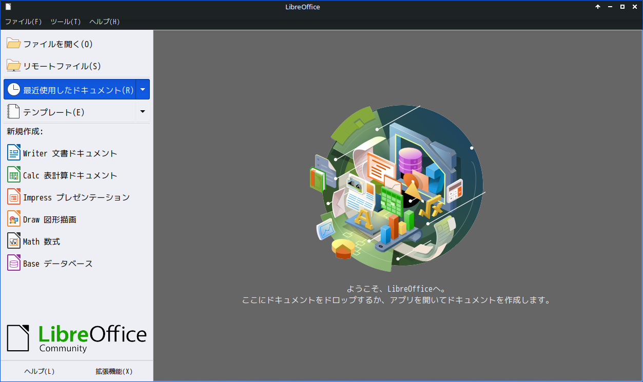 オフィススイートとして、「LibreOffice」がデフォルトでインストールされていますが、日本語化されていません。