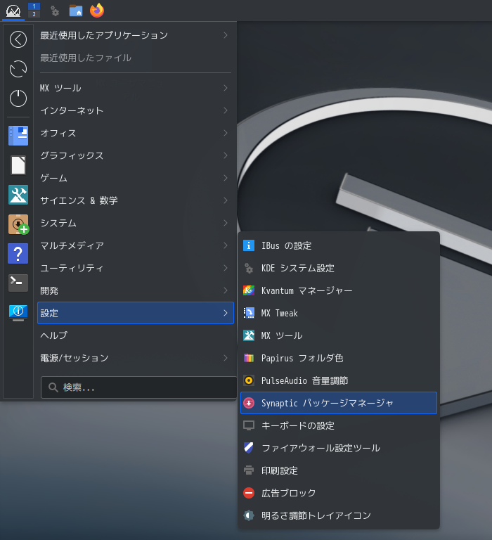 「MX パッケージインストーラ」で、「synaptic」を検索して、インストールします。