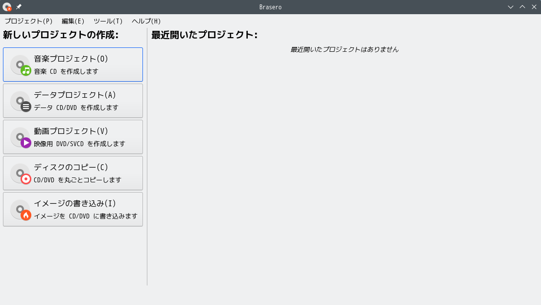 1. 概要 光ディスク(CD・DVD)のライティングソフトとして、「Brasero」を使用します。 2. インストール 「Synaptic」で、「brasero」を検索して、インストールします。 3. 起動 「スタート」→「マルチメディア」→「Brasero」