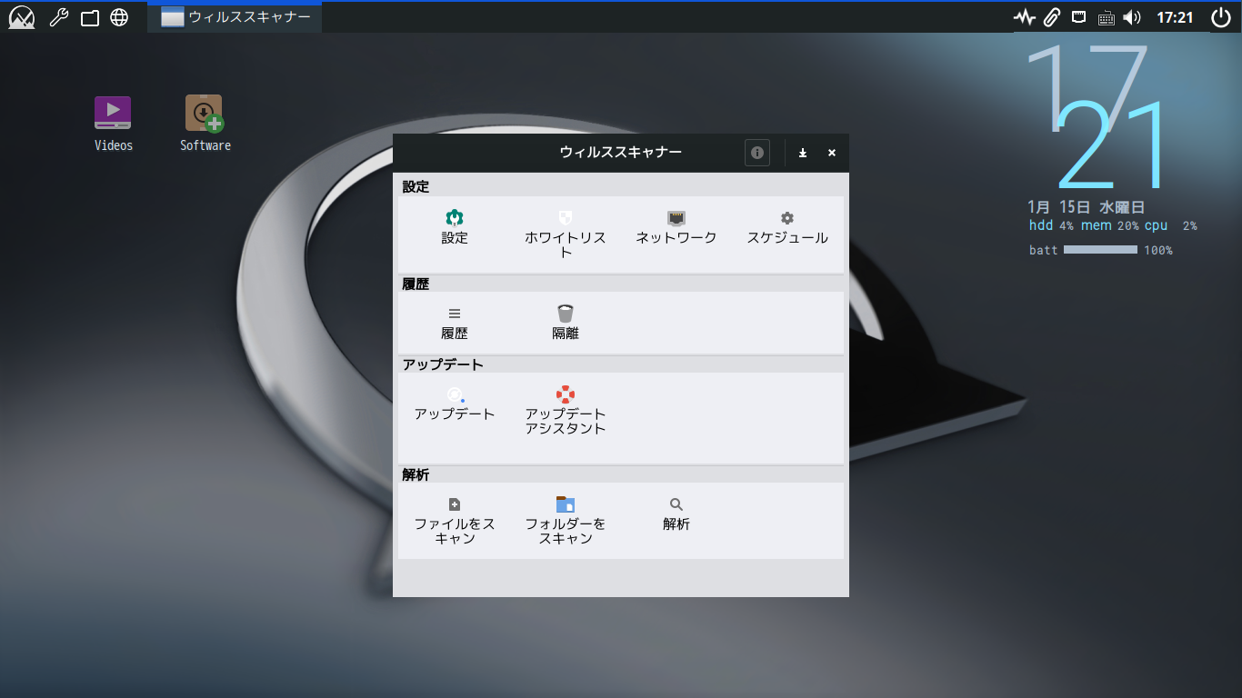 起動直後の状態です。 2025年1月15日の時点で、下記のバージョンでした。 操作等に関しては、「デスクトップ環境構築 - 共通事項 - アンチウイルスソフト ClamTk」をご参照ください。 |