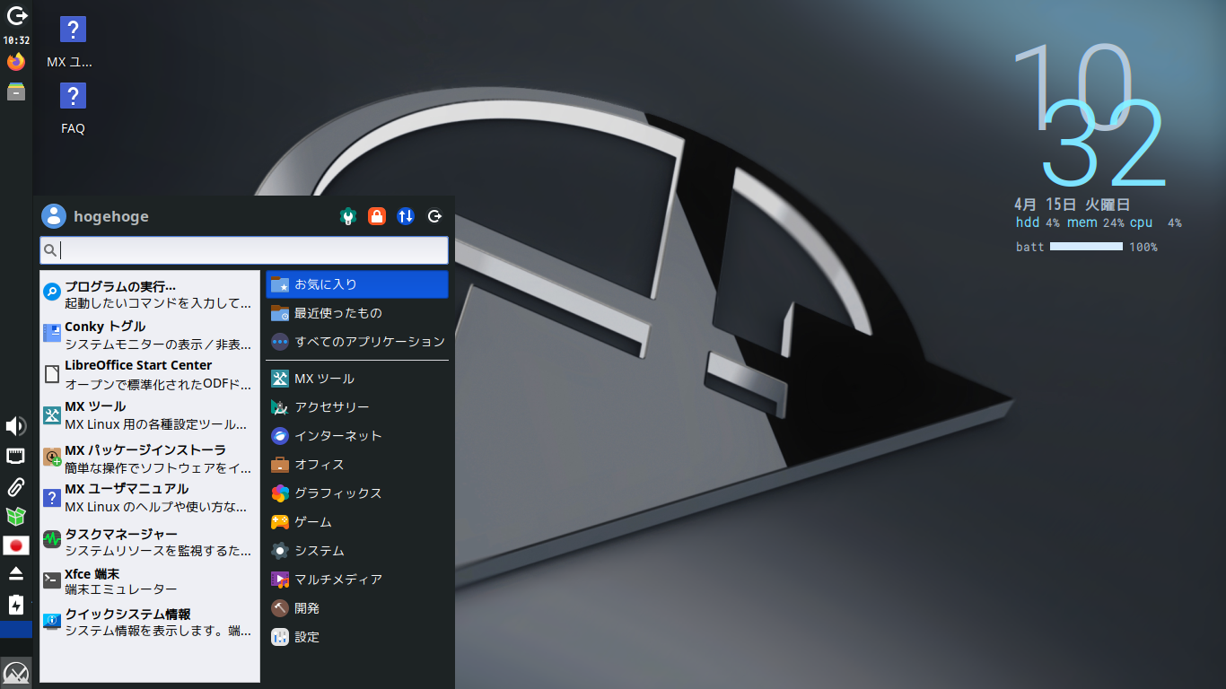 「MX Linux」の本来、正式なデスクトップは、「XFCE」です。