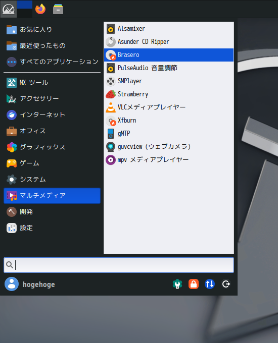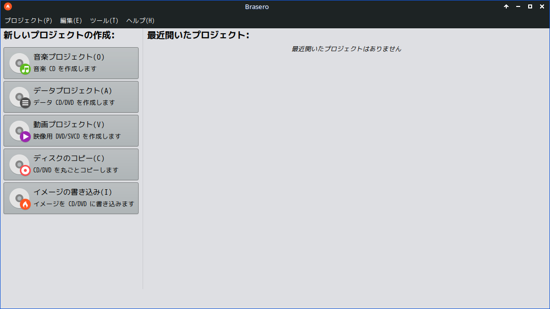 1. 概要 光ディスク(CD・DVD)のライティングソフトとして、「Brasero」を使用します。 2. インストール 「Synaptic」で、「brasero」を検索して、インストールします。 3. 起動 「スタート」→「マルチメディア」→「Brasero」