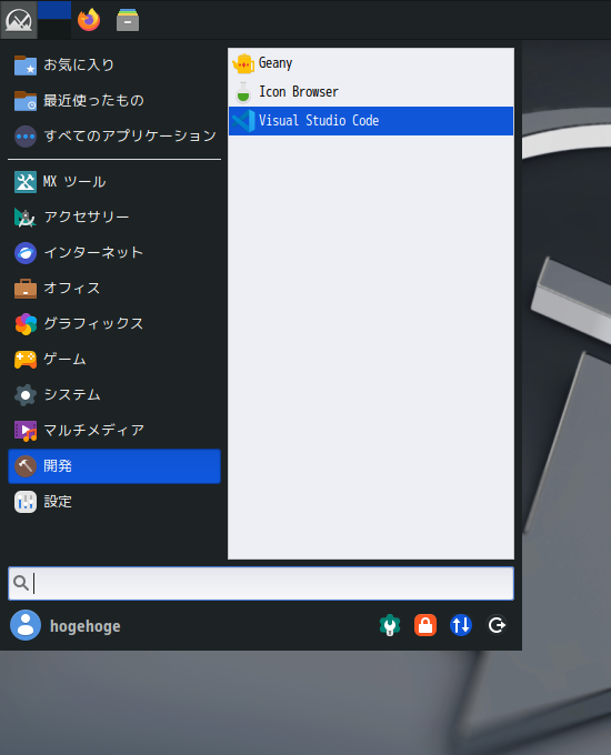1. 概要 開発環境として、「Visual Studio Code」を使用します。 2. インストール 「MX パッケージインストーラ」で、「vscode」を検索して、インストールします。 3. 起動 「スタート」→「開発」→「Visual Studio Code」
