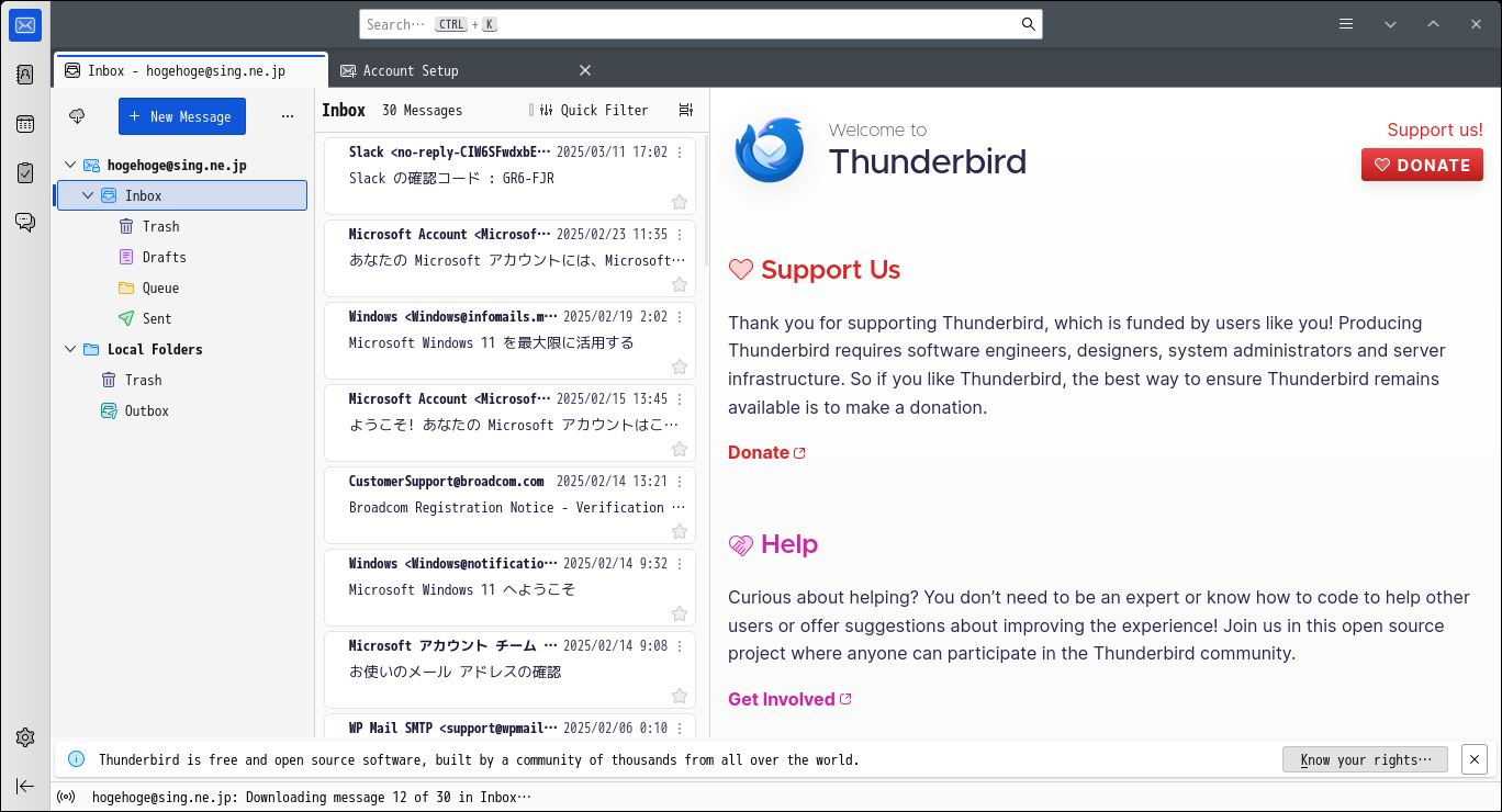 1. 概要 メールクライアントとして、あらかじめ、「Thunderbird」がインストールされていますが、日本語化されていません。 日本語化して使用します。 日本語化の手順・メッセージアカウントのセットアップ他、操作等に関しては、「メール クライアント ソフト - Thunderbird」をご参照ください。 2. 起動 「スタート」→「インターネット」→「Thunderbird 電子メールクライアント」