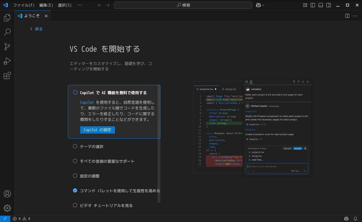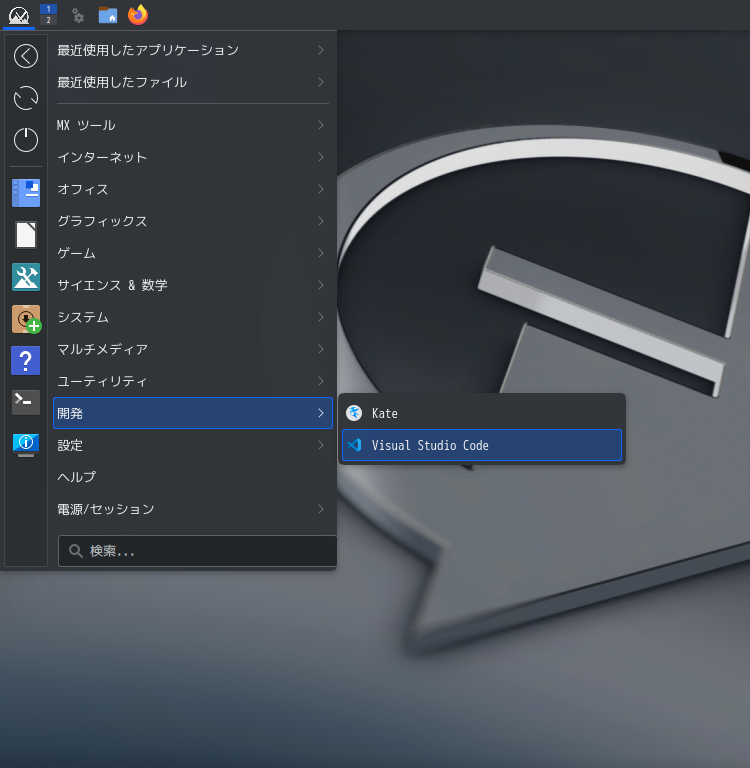 1. 概要 開発環境として、「Visual Studio Code」を使用します。 2. インストール 「MX パッケージインストーラ」で、「vscode」を検索して、インストールします。 3. 起動 「スタート」→「開発」→「Visual Studio Code」 (前回、カテゴリが「アクセサリ」になっておりましたが、今回は「開発」になっています)