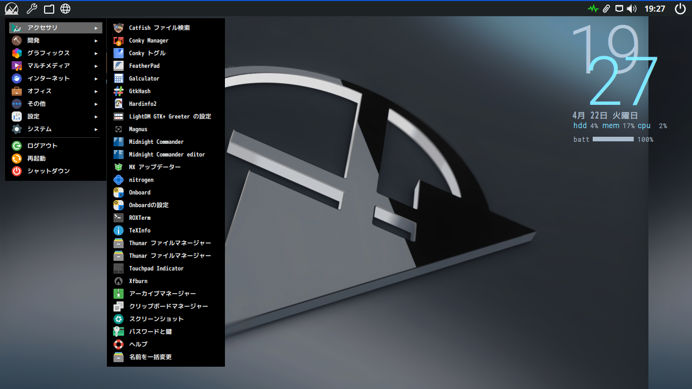 メニューは、「jgmenu」をインストールして使用します(「パネル・ツールバーの項に記述しています」)。