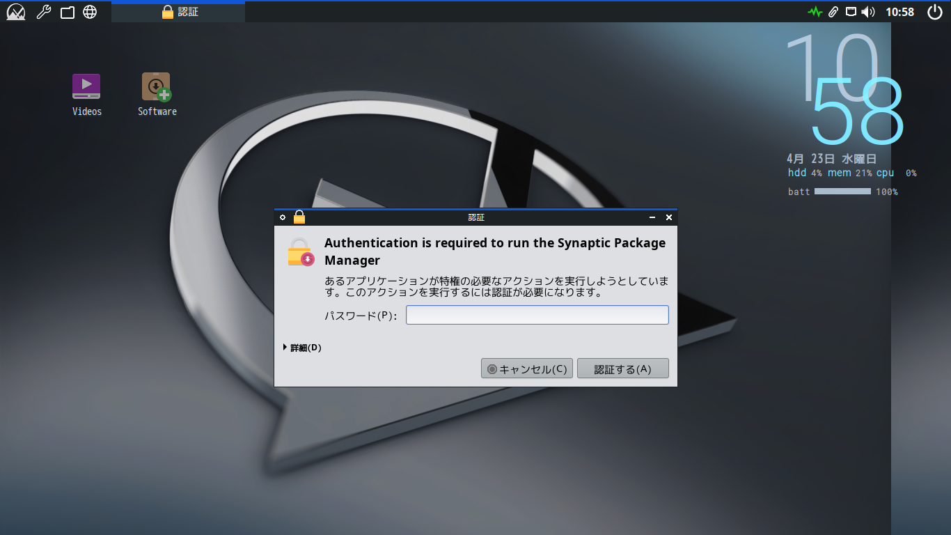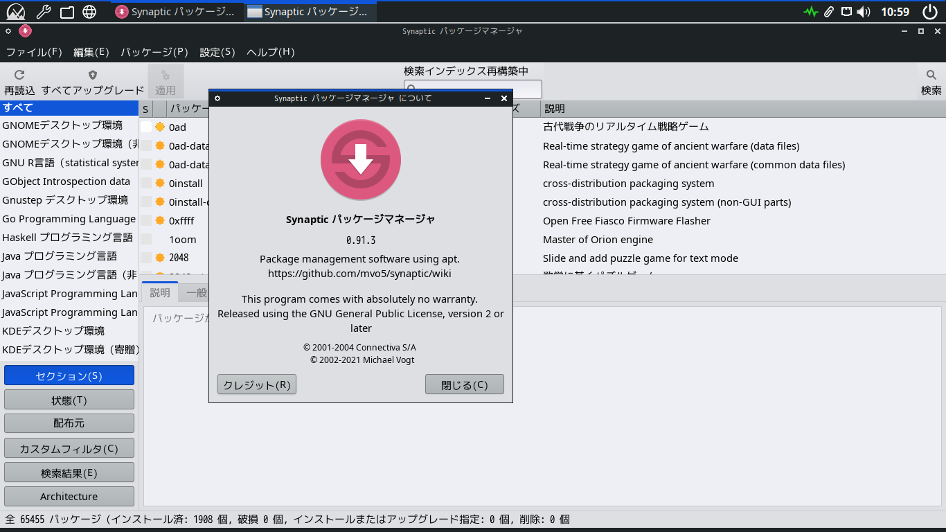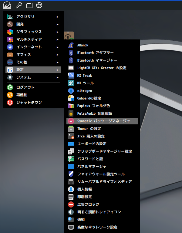 1. 概要 パッケージ管理フロントエンドとして「Synaptic」と「MX パッケージインストーラ」がインストールされています。 「Linux」の一般的なパッケージは「Synaptic」を使用し、「MX Linux」固有のパッケージは「MX パッケージインストーラ」を使用するように使い分けます。 操作方法等は、いずれも、「Linux - 共通事項 - パッケージ管理フロントエンド」をご参照ください。 2. Synaptic 「スタート」→「設定」→「Synaptic パッケージマネージャ」