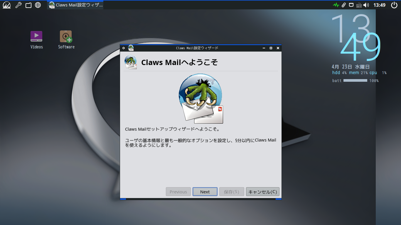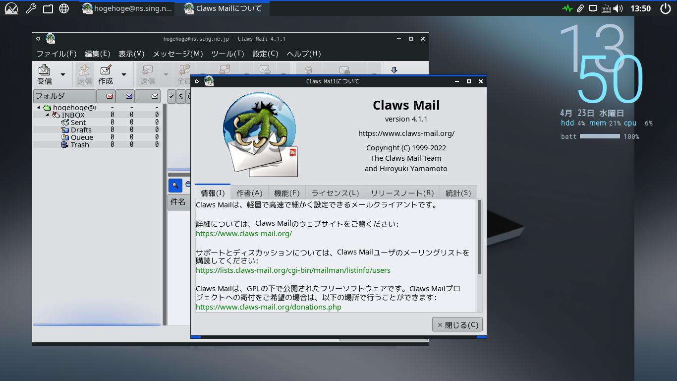 1. 概要 メールクライアントは、インストールされていません。 「Claws Mail」をインストールして、使用します。 設定ウィザードや操作に関しては、「メール クライアント ソフト - Claws Mail」をご参照ください。 2. インストール 「Synaptic」で、「claws-mail」を検索して、「claws-mail-i18n」をインストールします。 3. 起動 「スタート」→「インターネット」→「Claws Mail」