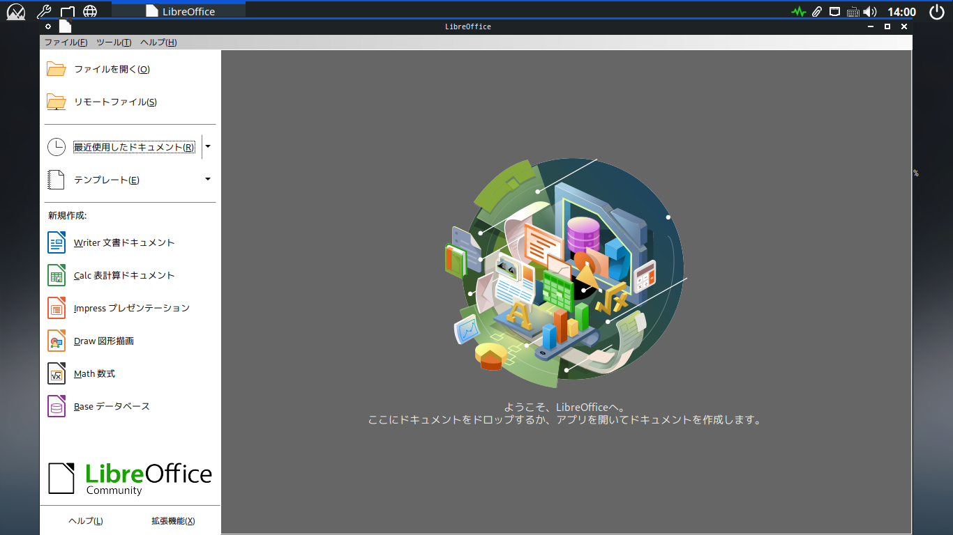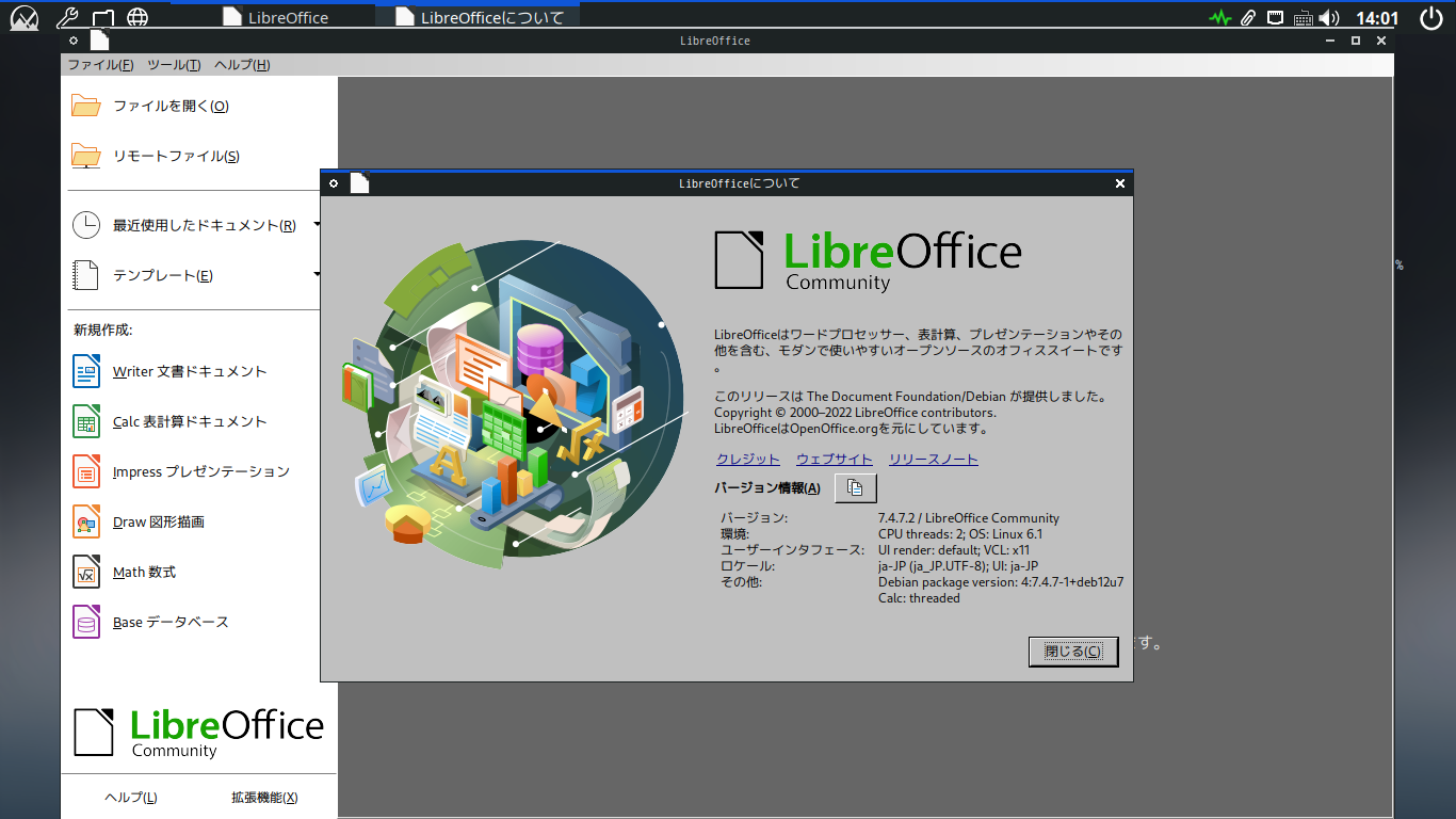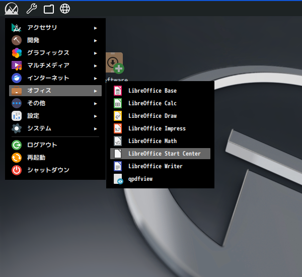 1. 概要 オフィススイートは、インストールされていませんでした。 2. インストール 「Synaptic」で、「libreoffice」を検索して、「libreoffice」と「libreoffice-l10n-ja」をインストールします。 3. 起動 「スタート」→「オフィス」→「LibreOffice Start Center」