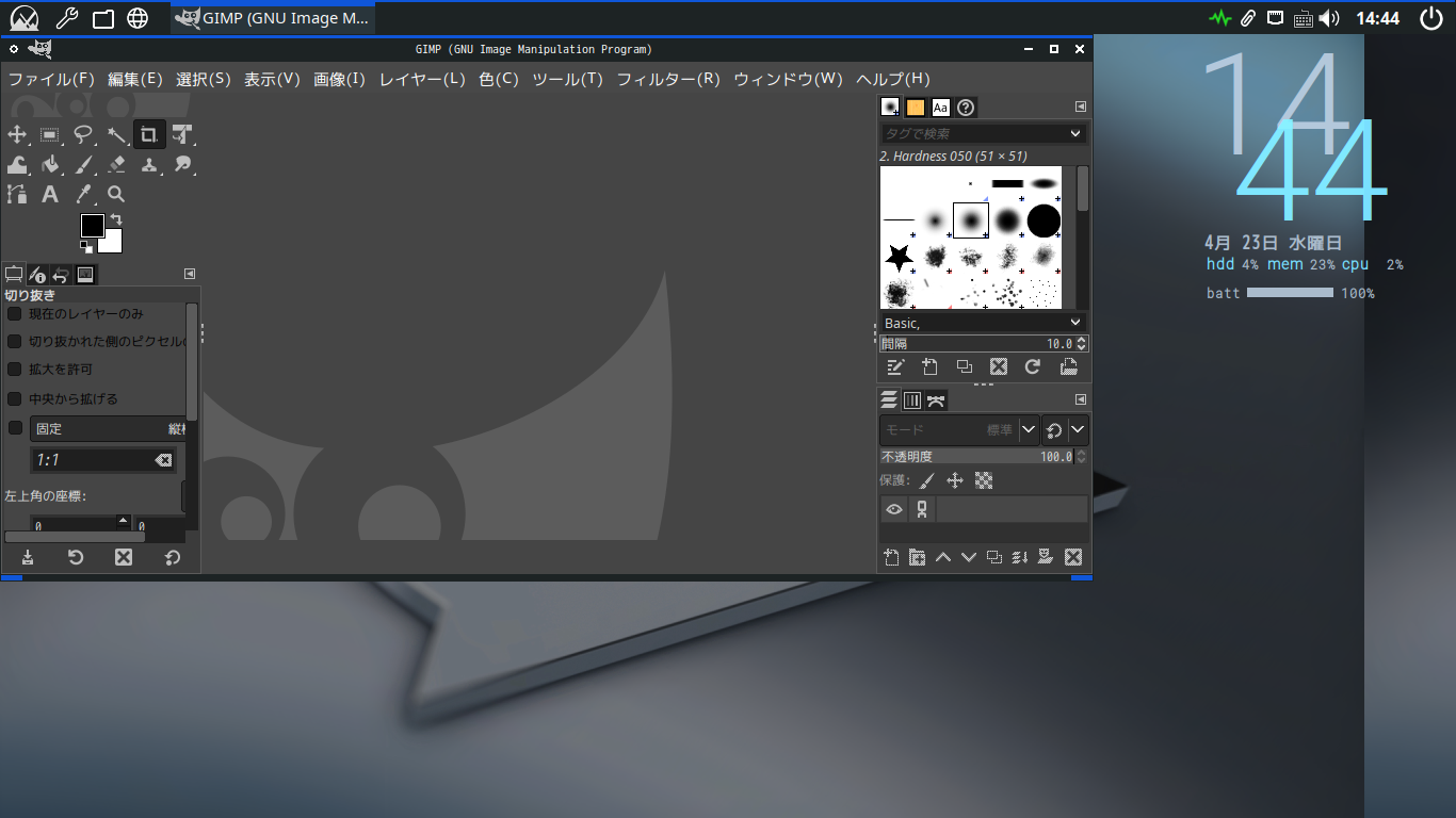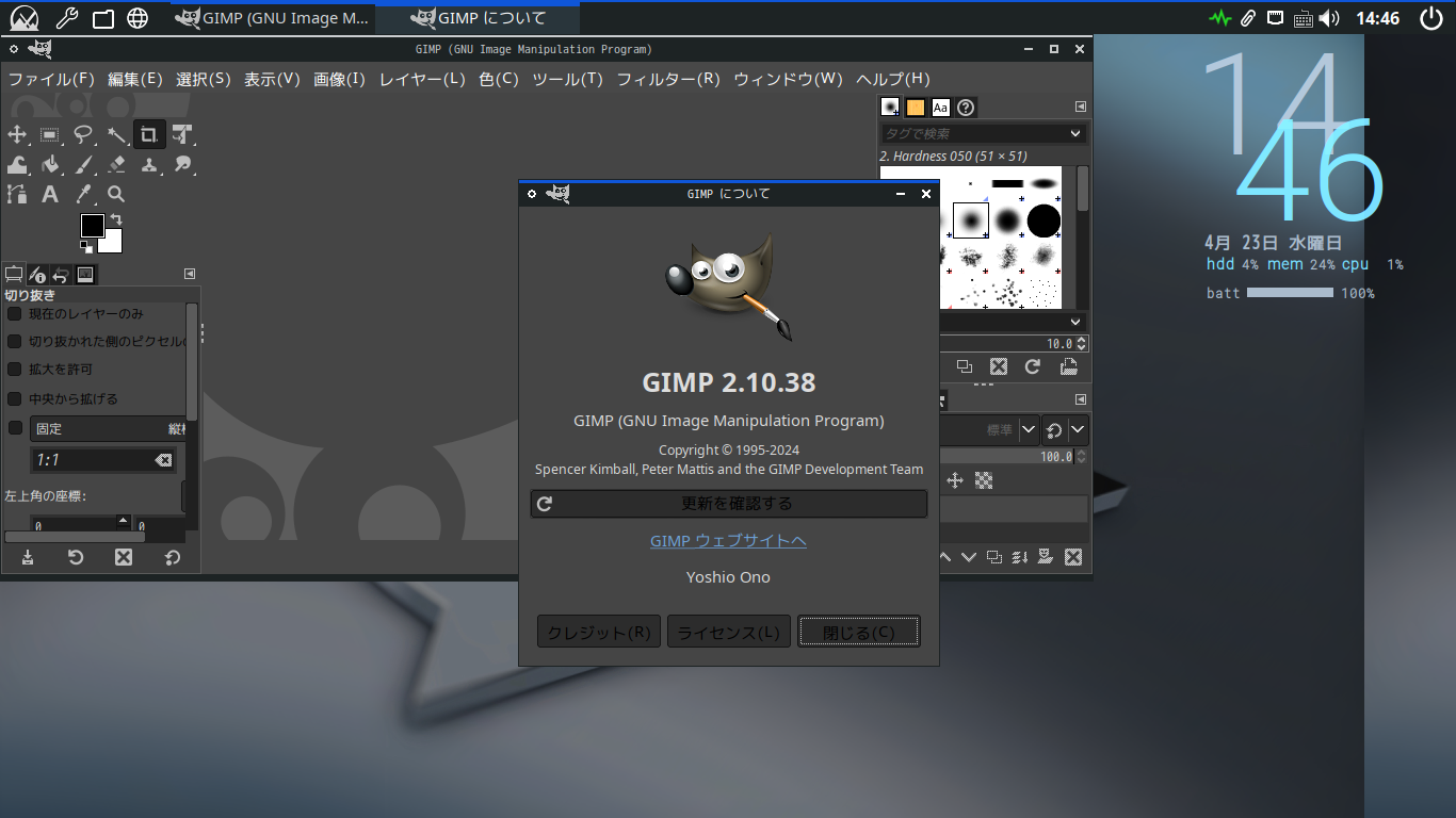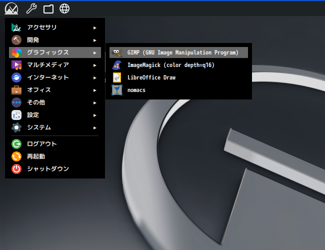 1. 概要 画像編集ソフトとして、「GIMP」を使用します。 2. インストール 「Synaptic」で、「gimp」を検索して、インストールします。 3. 起動 「スタート」→「グラフィックス」→「GIMP」