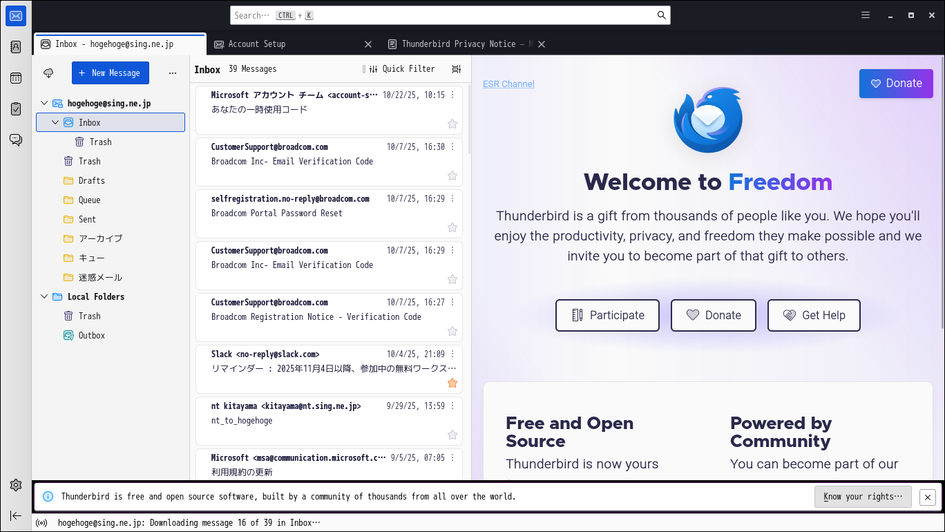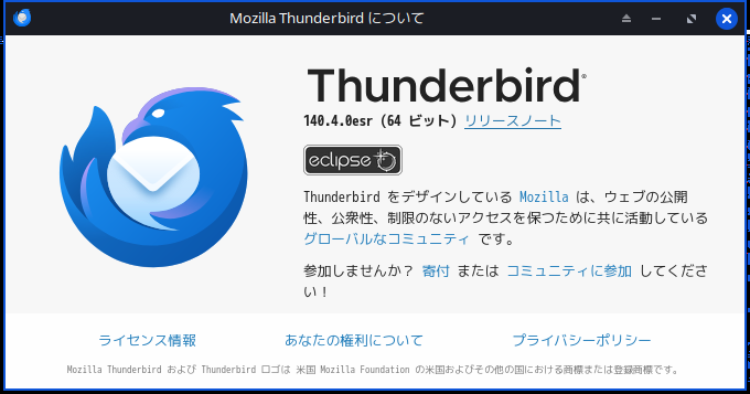 1. 概要 メールクライアントとして、あらかじめ、「Thunderbird」がインストールされていますが、日本語化されていません。 日本語化して使用します。 日本語化の手順・メッセージアカウントのセットアップ他、操作等に関しては、「メール クライアント ソフト - Thunderbird」をご参照ください。 2. 起動 「スタート」→「インターネット」→「Thunderbird 電子メールクライアント」