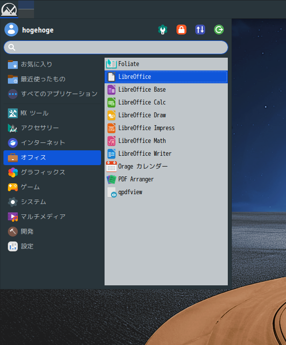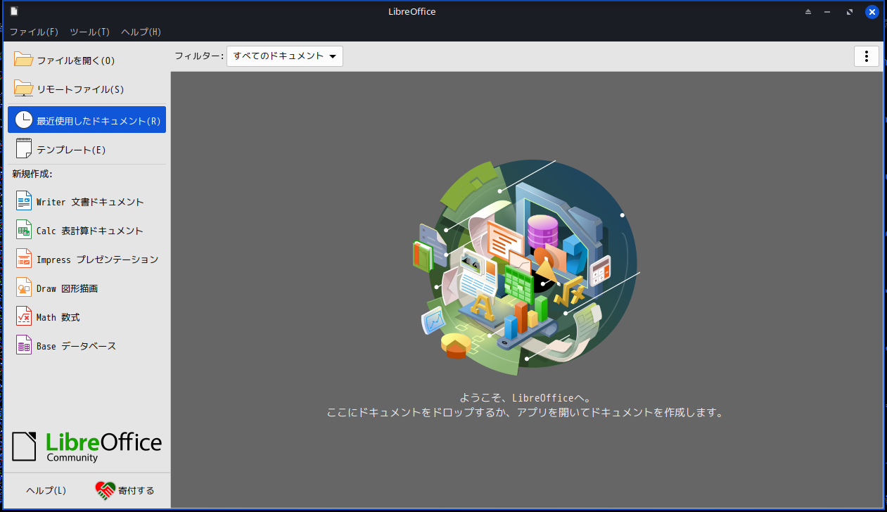 オフィススイートとして、「LibreOffice」がデフォルトでインストールされていますが、日本語化されていません。