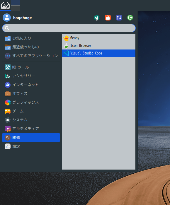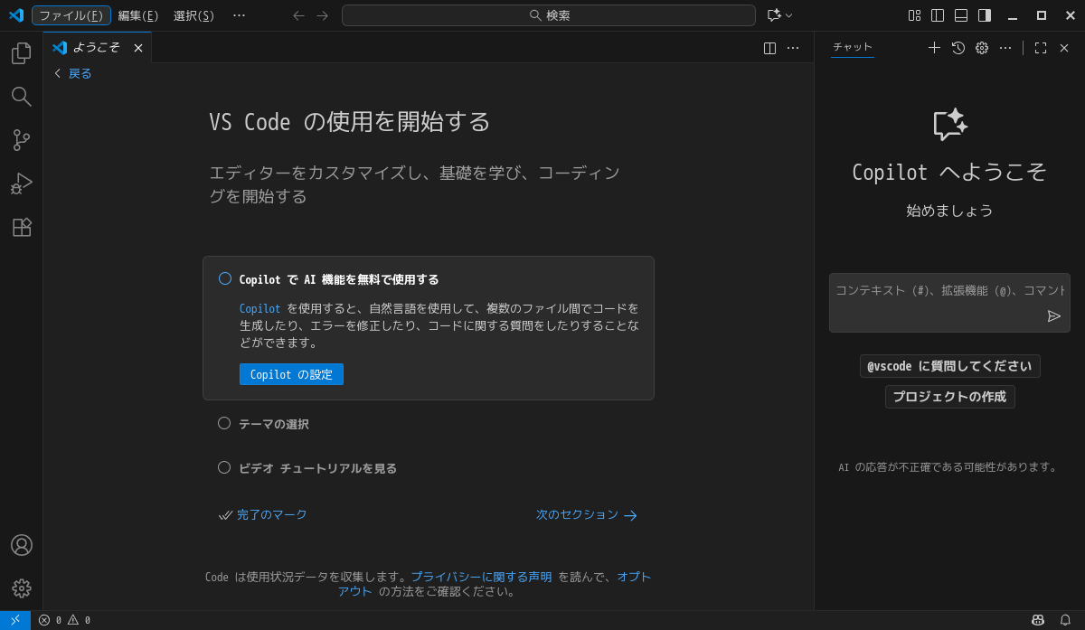 1. 概要 開発環境として、「Visual Studio Code」を使用します。 2. インストール 「MX パッケージインストーラ」で、「vscode」を検索して、インストールします。 3. 起動 「スタート」→「開発」→「Visual Studio Code」