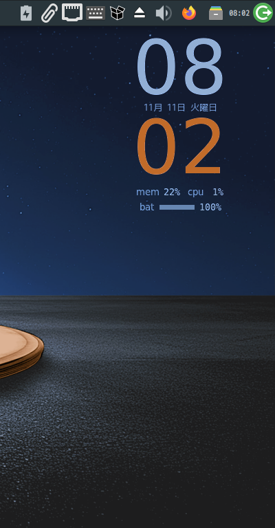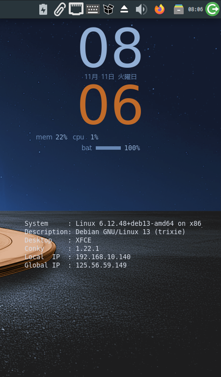 末尾に「システム情報」「ディストリビューション」「デスクトップ名」「Conky バージョン」「IP アドレス」を表示します。