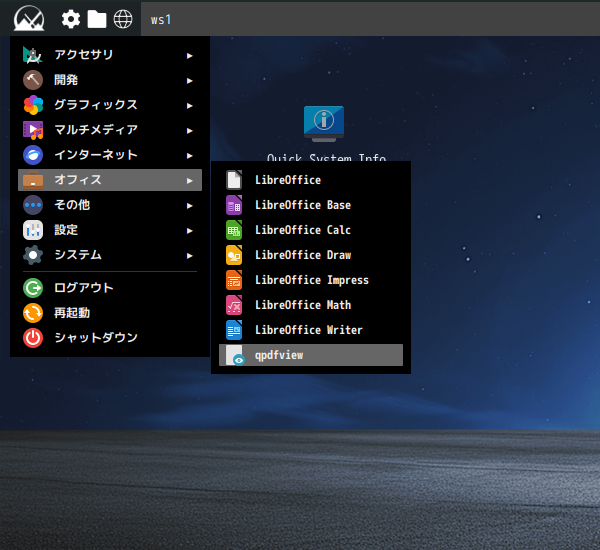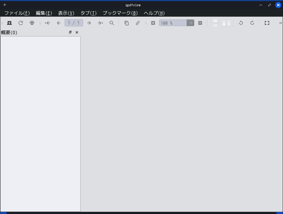 1. 概要 ドキュメントビューアとして、「qpdfview」を使用します。 「qpdfview」は、デフォルトでインストールされています。 2. 起動 「スタート」→「オフィス」→「qpdfview」