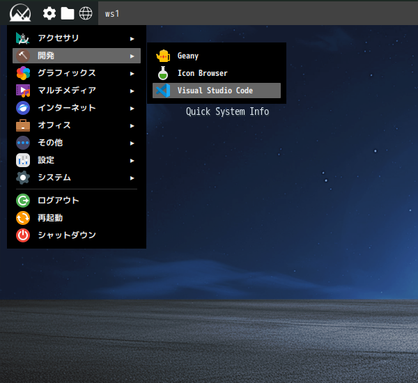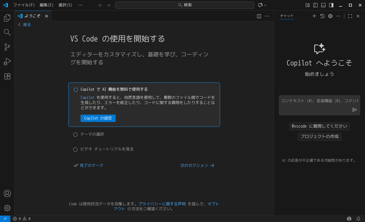 1. 概要 開発環境として、「Visual Studio Code」を使用します。 2. インストール 「MX パッケージインストーラ」で、「vscode」を検索して、インストールします。 3. 起動 「スタート」→「開発」→「Visual Studio Code」