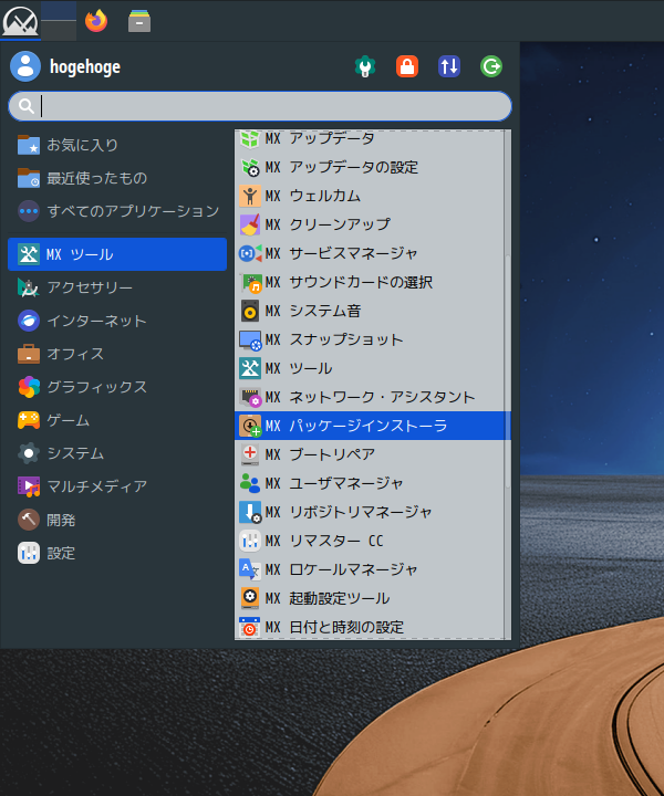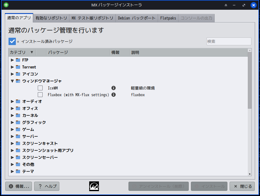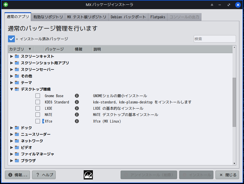 上記以外のデスクトップ環境を使用するには、「MX パッケージインストーラ」を使用してインストールすることになります。