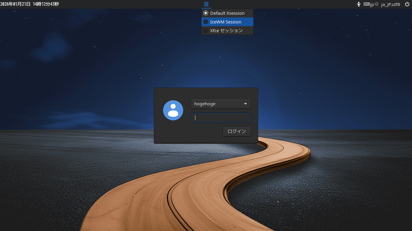ログイン画面に、「IceWM」の選択肢が出現しています。