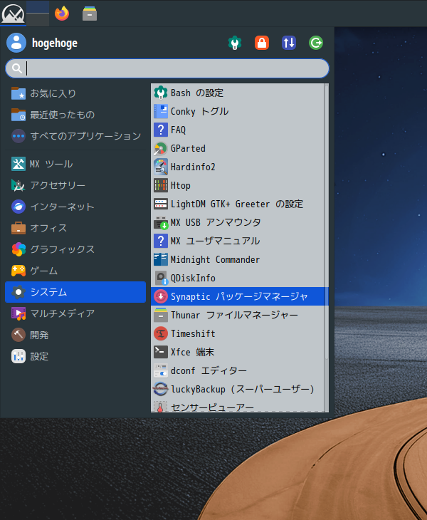 「Linux」の一般的なパッケージは「Synaptic」を使用し、「MX Linux」固有のパッケージは「MX パッケージインストーラ」を使用するように使い分けます。