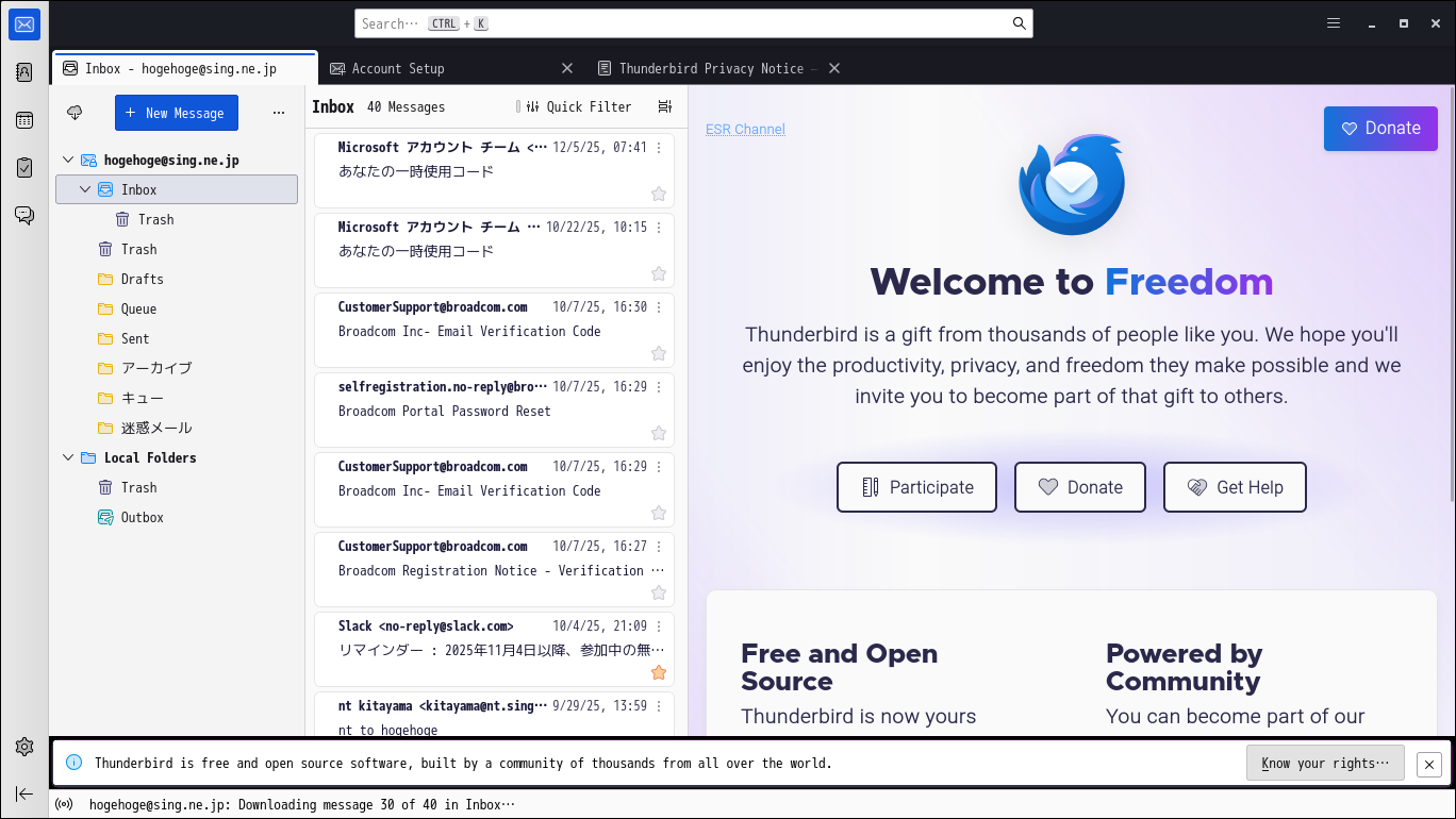 1. 概要 メールクライアントとして、あらかじめ、「Thunderbird」がインストールされていますが、日本語化されていません。 日本語化して使用します。 日本語化の手順・メッセージアカウントのセットアップ他、操作等に関しては、「メール クライアント ソフト - Thunderbird」をご参照ください。 2. 起動 「スタート」→「インターネット」→「Thunderbird 電子メールクライアント」