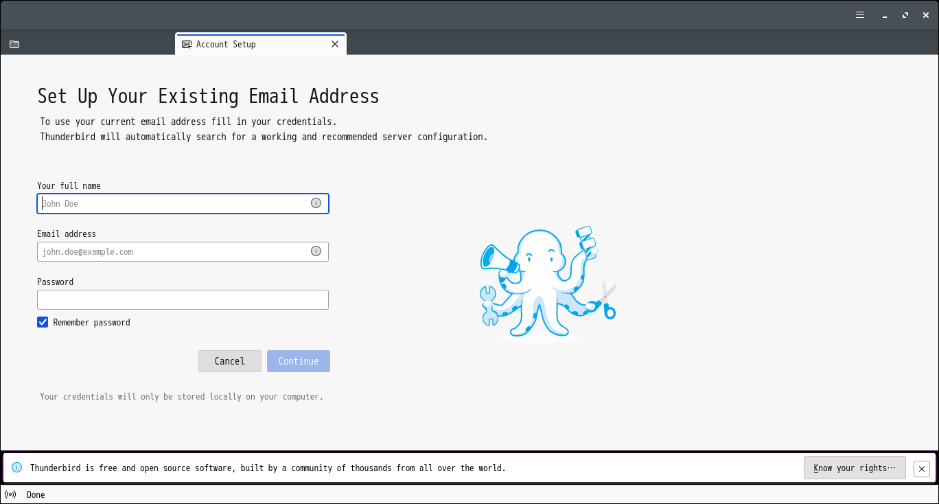 初回起動時は、「メールアカウントのセットアップ」から始まります。