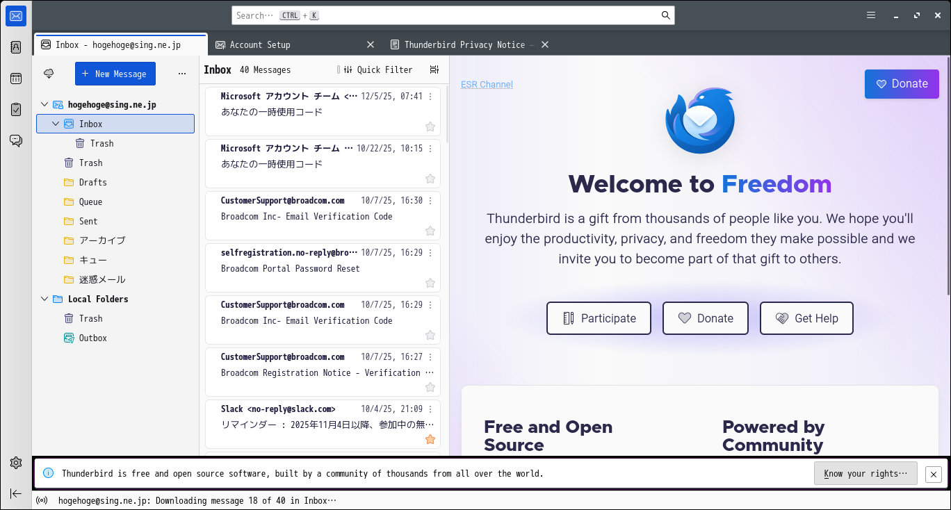起動後に、受信トレイを開いた状態です。